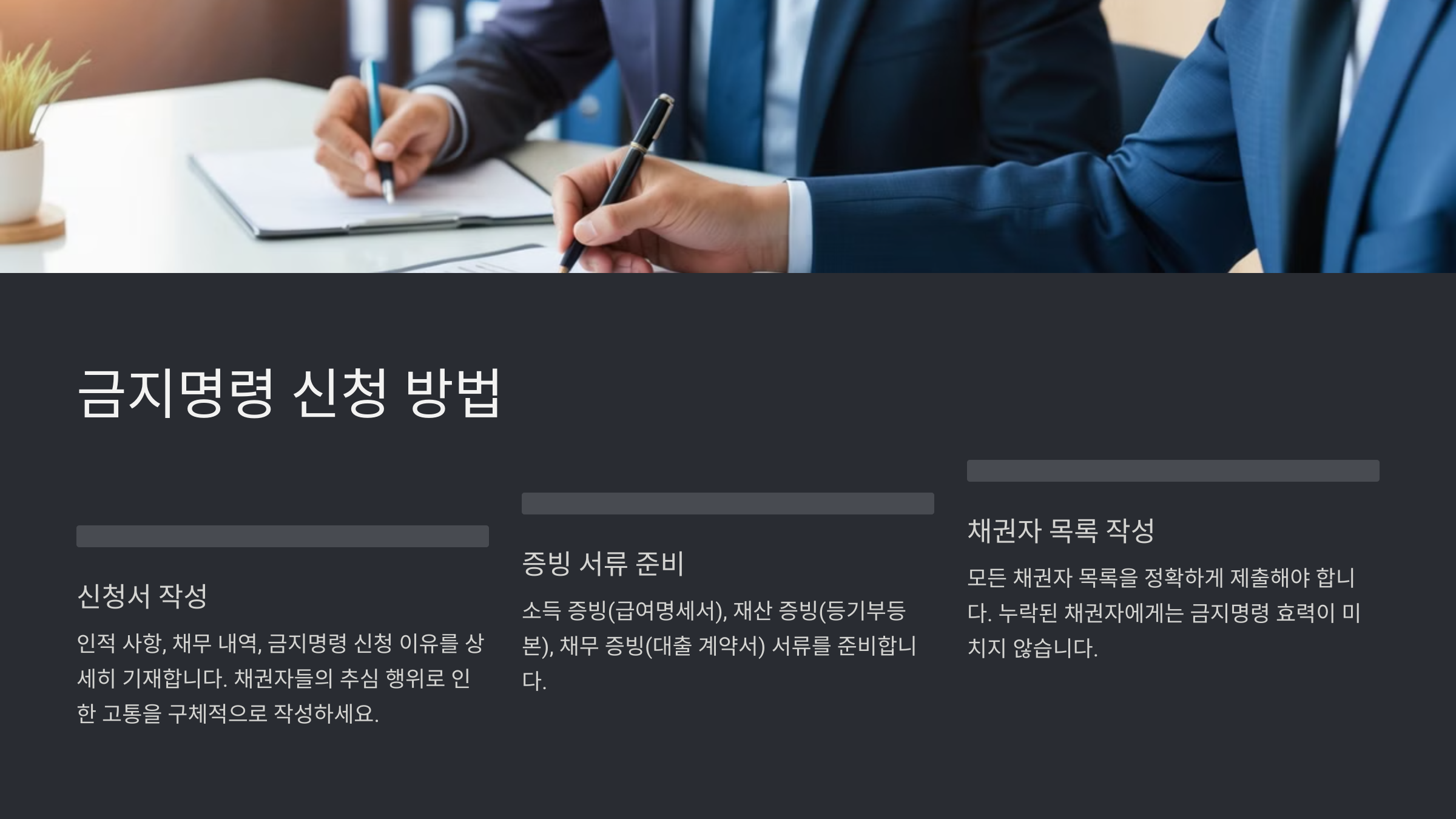 - 채권자 목록, 숨김없이 모두 공개: 금지명령 신청 시 모든 채권자 목록을 정확하게 제출해야 합니다. 단 한 곳이라도 누락되면, 해당 채권자에게는 금지명령의 효력이 미치지 않아 추심 행위가 계속될 수 있습니다. 빚이 있다는 사실을 숨기려 하지 말고, 솔직하게 모든 채권자를 기재해야 합니다.