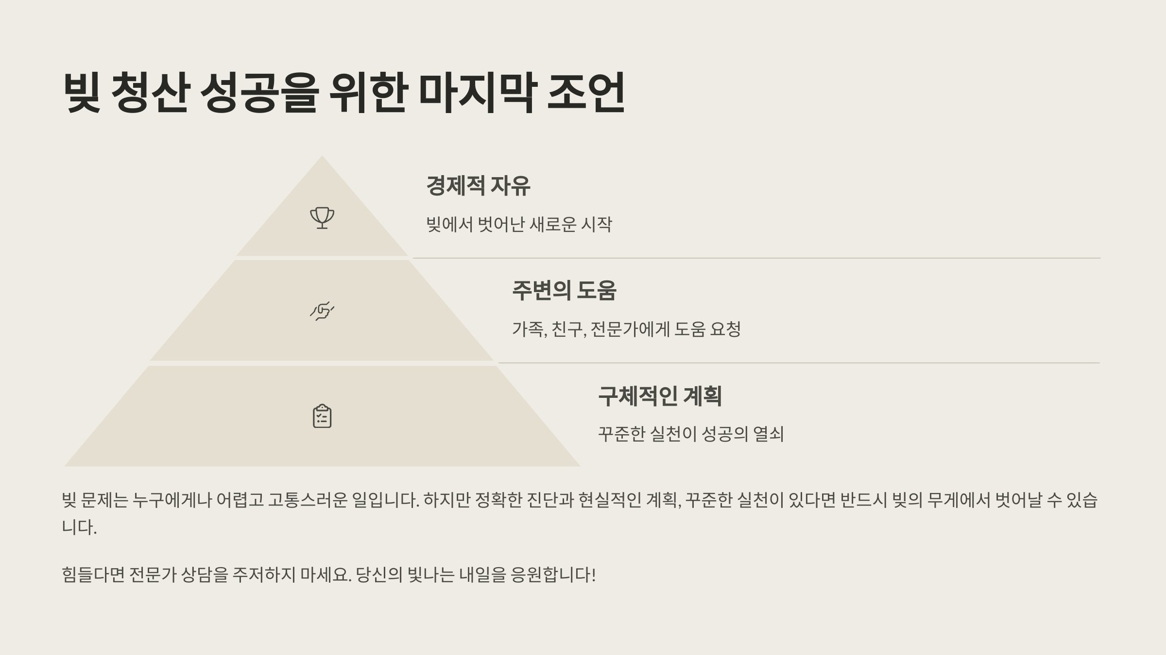 빚 문제는 누구에게나 어렵고 고통스러운 일입니다. 하지만 정확한 진단과 현실적인 계획, 꾸준한 실천이 있다면 반드시 빚의 무게에서 벗어날 수 있습니다. 이 글이 여러분의 빚 갚기 여정에 작은 등불이 되기를 바랍니다. 힘들다면 전문가 상담을 주저하지 마세요. 당신의 빛나는 내일을 응원합니다!