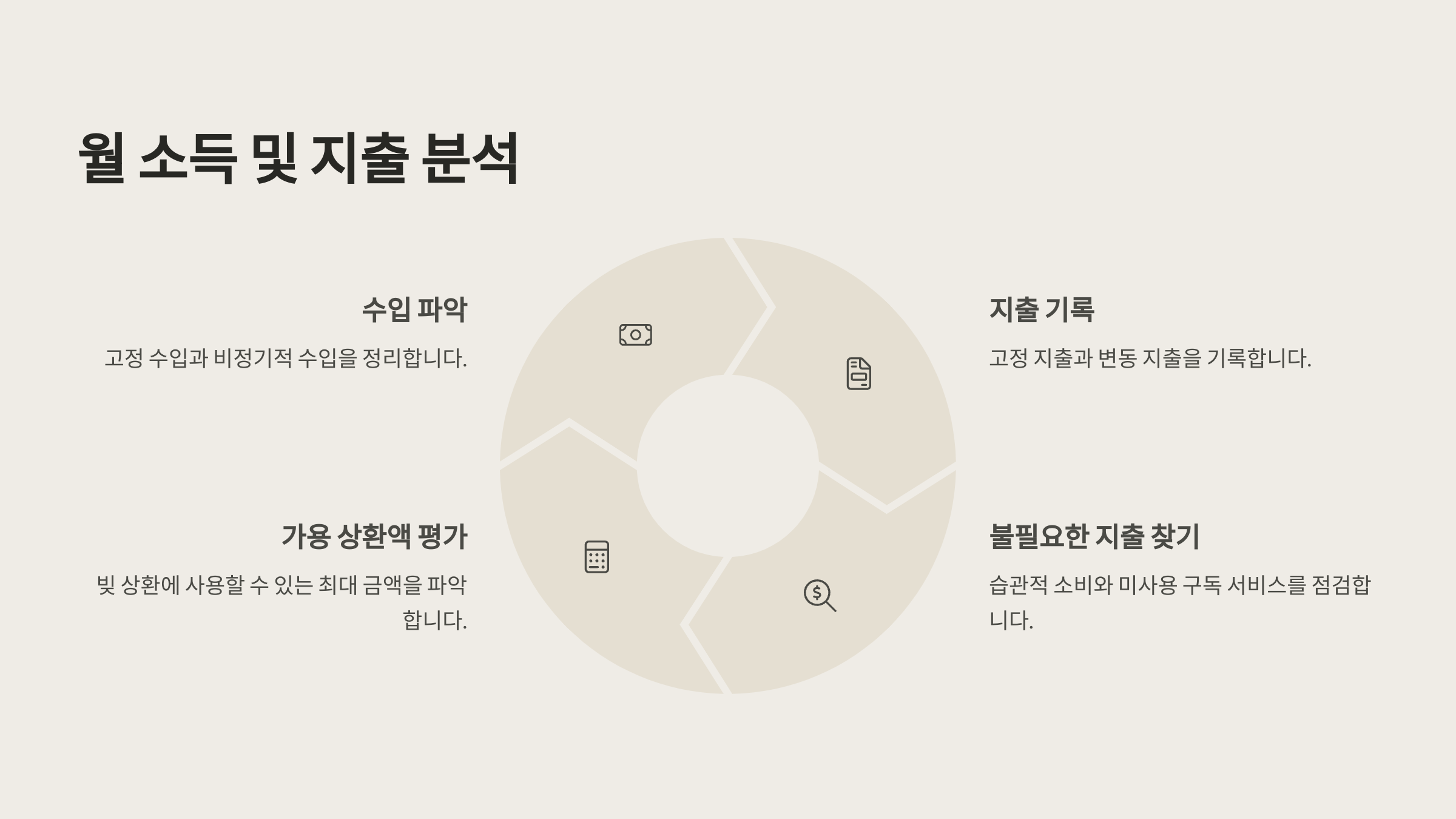 - 월 가용 상환액 평가: 월 총수입 - 월 필수 생활비를 계산하여 빚 상환에 사용할 수 있는 최대 금액을 파악합니다.