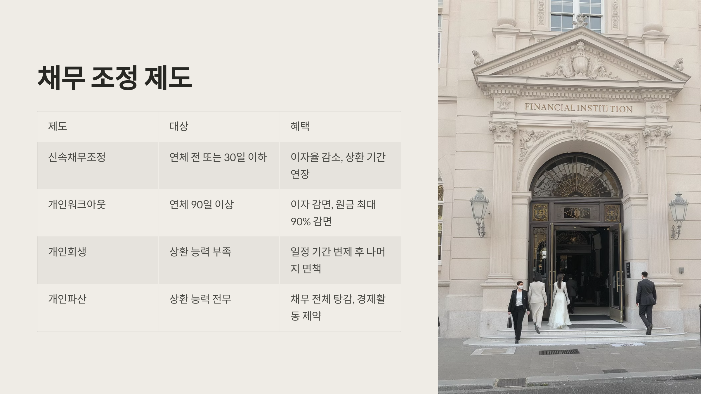 | 신속채무조정 | 연체 전 또는 30일 이하 | 이자율 감소, 상환 기간 연장 |